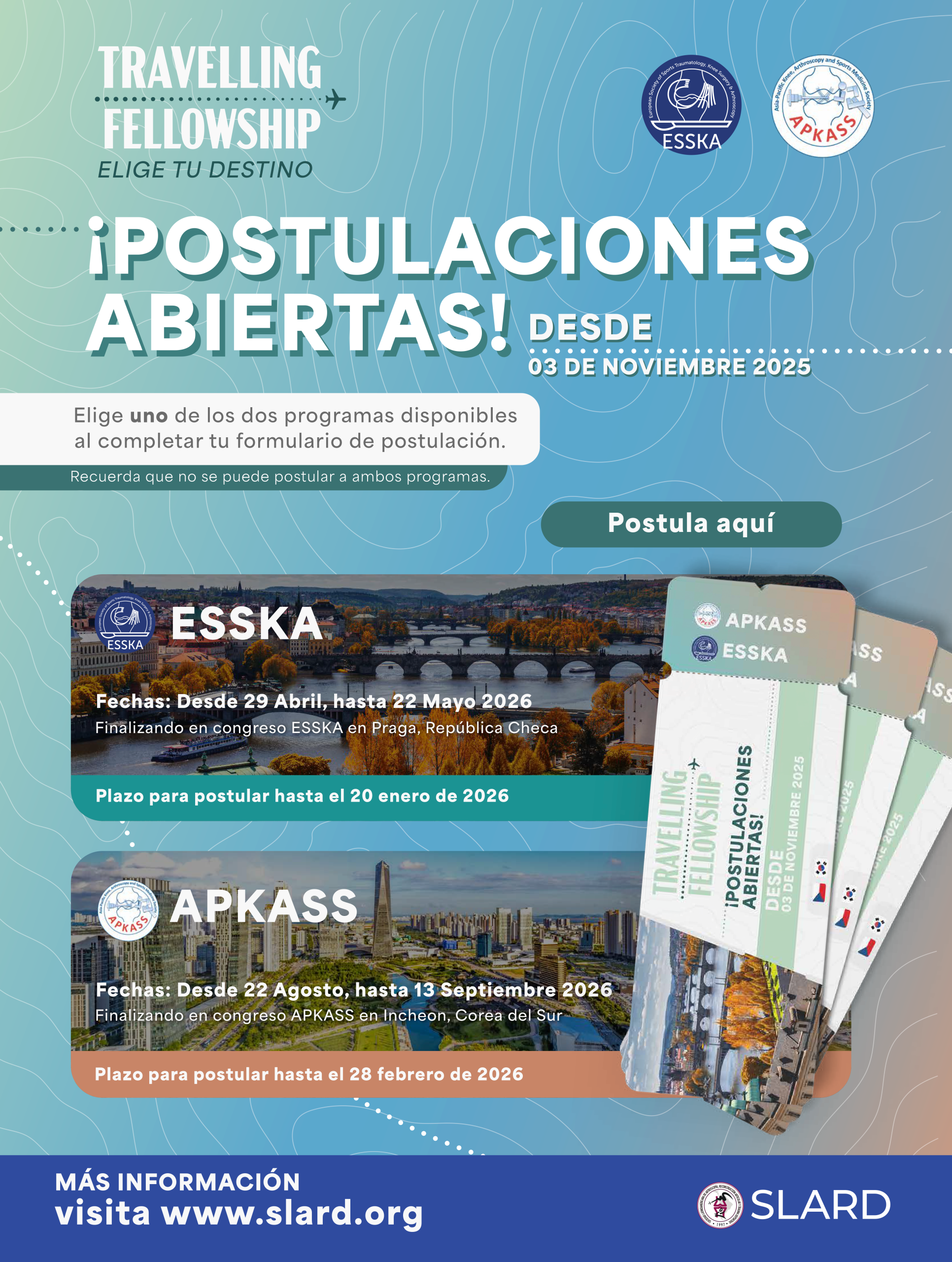 Se abre la convocatoria para las becas viajeras hacia República Checa y Corea del Sur, culminando en los congresos ESSKA 206 y APKASS 2026 respectivamente.