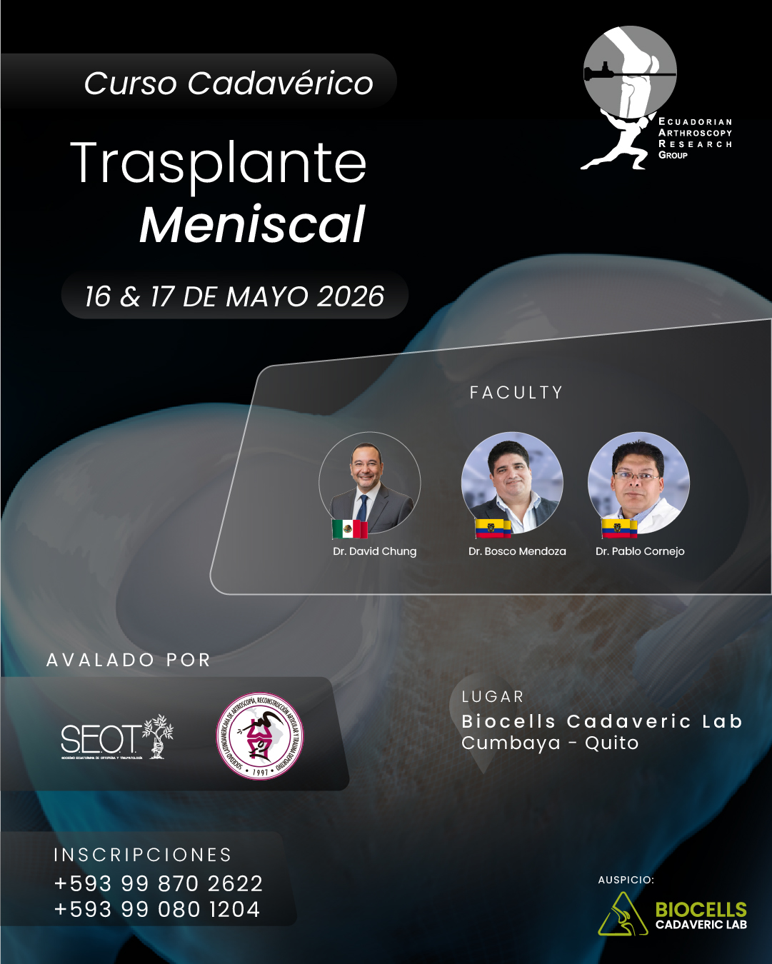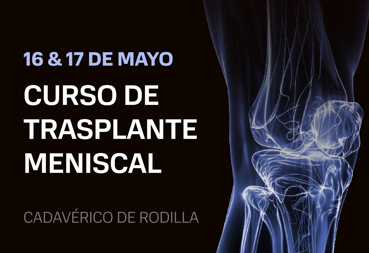 Curso Trasplante Meniscal No te quedes fuera del Curso Trasplante Meniscal, a realizarse del 16 y el 17 de abril de 2026 MÁS INFORMACIÓN E INSCRIPCIONES + Añadir Google Calendar + exportación iCal / Outlook 00 días 00 horas 00 minutos 00 segundos Fecha May 16 - 17 2026 Hora Todo el día Compartir este evento